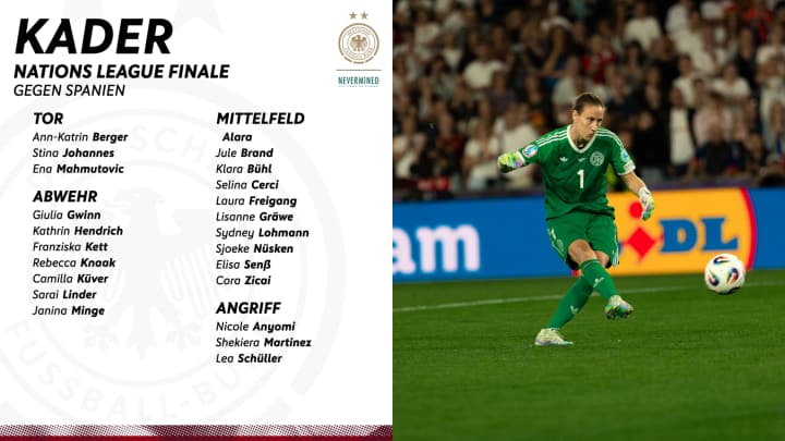 Bundestrainer Christian Wück hat seinen 23-köpfigen Kader für die beiden Finalpartien in der Nations League gegen Spanien bekanntgegeben. Neben den Torhüterinnen Ann-Katrin Berger und Ena Mahmutovic kehren auch Rebecca Knaak und Sarai Linder zurück.
